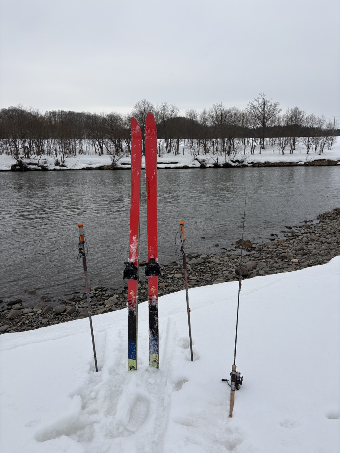 それを狙って、夏場はひどい藪の河原は雪で潰れているので、歩くスキーでスイスイーっと川まで移動して、釣りをしてみました。