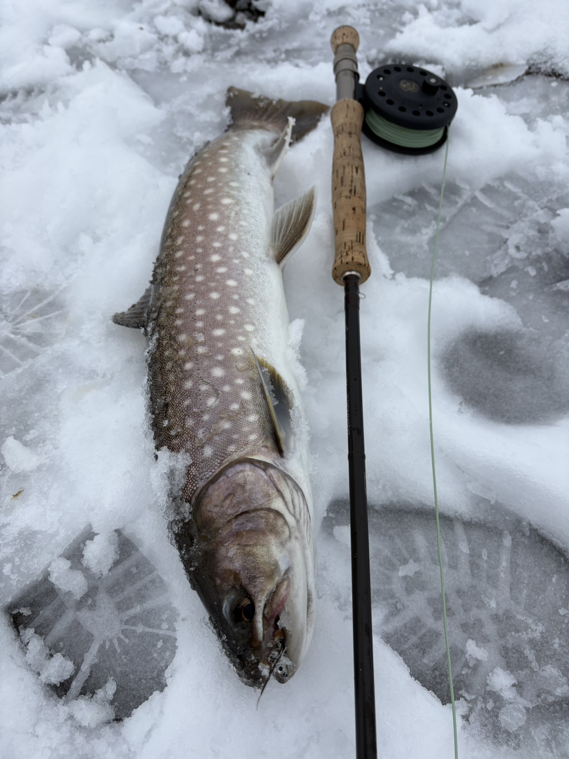 上がったきたのは55cmくらいのお腹がパンパンのアメマス。
